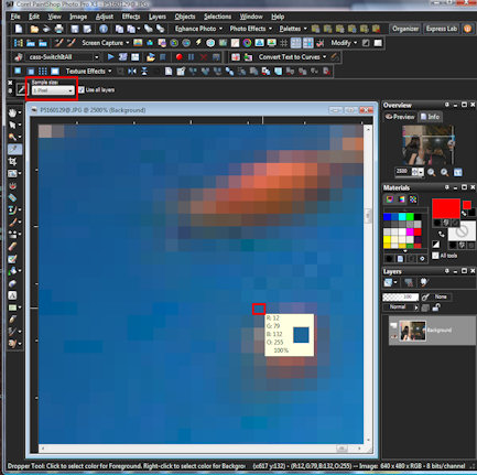 Using the color picker and my photo (enlarged so that I can see individual pixels) I will be picking a color from it. On the palette toolbar to select the sample size. Choosing 1x1 will pick up the color of the pixel you have chosen.